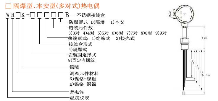 □隔爆型、本安型多對(duì)式熱電偶的規(guī)格及型號(hào)表示示意圖