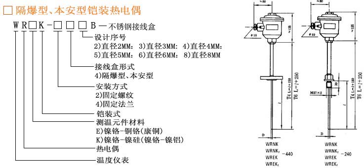 □隔爆型、本安型鎧裝熱電偶的規(guī)格及型號(hào)表示示意圖