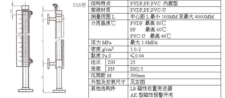注意:1.以上表中的外型及安裝尺寸詳見C10~C18圖示。液位計底部的排污閥用戶在訂貨時須注明,一般情況下液位計出廠不配排污閥。
