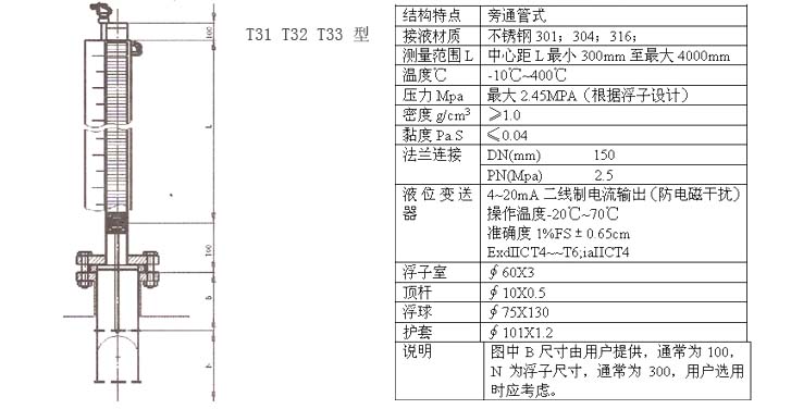 精確度:10mm 工作壓力:≤2.5Mpa(普通) ≤16Mpa(高壓) 介質(zhì)密度:≥0.45g/cm3 介質(zhì)溫度:-196~+400℃ 介質(zhì)粘度:≤0.4Pa·S,對(duì)于粘度大的介質(zhì)或溫度低時(shí)易結(jié)晶的介質(zhì),可根據(jù)用戶要求選用加熱型夾套式液位計(jì)?! ?連接法蘭:采用化工部最新頒布的HG20592~20635-97法蘭標(biāo)準(zhǔn)。
