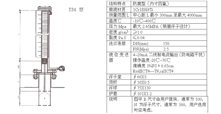 精確度:10mm 工作壓力:≤2.5Mpa(普通) ≤16Mpa(高壓) 介質(zhì)密度:≥0.45g/cm3 介質(zhì)溫度:-196~+400℃ 介質(zhì)粘度:≤0.4Pa·S,對(duì)于粘度大的介質(zhì)或溫度低時(shí)易結(jié)晶的介質(zhì),可根據(jù)用戶(hù)要求選用加熱型夾套式液位計(jì)?! ?連接法蘭:采用化工部最新頒布的HG20592~20635-97法蘭標(biāo)準(zhǔn)。