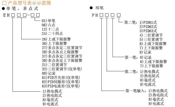 □內填入輸入點數(shù),輸入點數(shù)6,12,24點時分別填6,12,24.(例:mV輸入,6點記錄儀為EH800-06)。