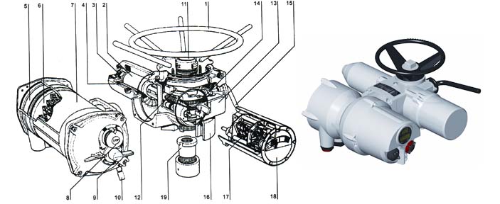 ![]() 1-手輪 2-三相電動機 3-力矩彈簧 4-熱繼電器 5-獨立的密封端子盒