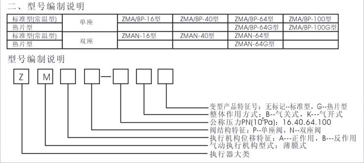 1.氣動(dòng)薄膜直通雙座調(diào)節(jié)閥(ZMAN型):閥內(nèi)有兩個(gè)閥座,具有流通能力大、不平衡力小、作用方式更換方便等優(yōu)點(diǎn),因而得到廣泛的使用。