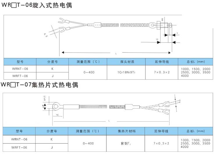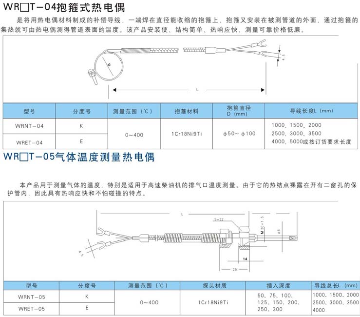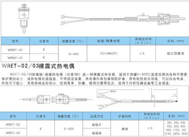 WRET-01 WRNT-01 型熱電偶的作用原理,分度特殊性及允許偏差,參比端(冷接點)溫度補償,以及與顯示測量儀表的聯接方法均與一般熱電偶相同。