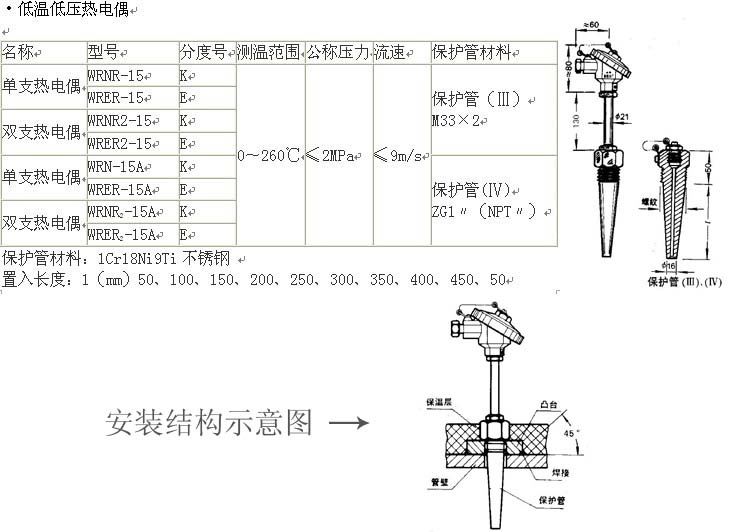 熱套式熱電偶產(chǎn)品有五種不同的結(jié)構(gòu)和安裝方式,用戶可根據(jù)不同的溫度、壓力及蒸氣流速來選用,安裝尺寸及方式參照EBASCO規(guī)范。